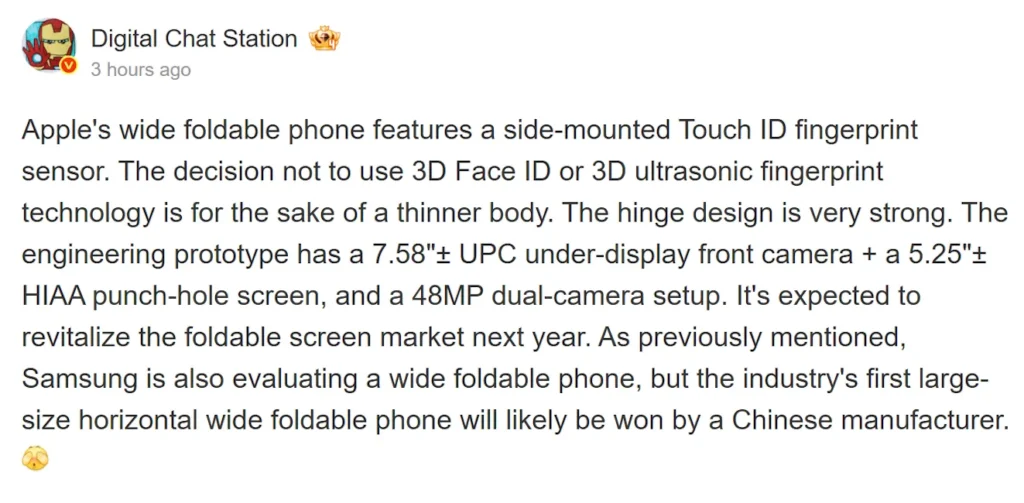 According to Weibo tipster Digital Chat Station (DCS), Apple’s current foldable iPhone prototype includes a fingerprint sensor integrated into the side button. This aligns with earlier insights from analyst Ming-Chi Kuo, who also indicated that Touch ID would replace Face ID on the iPhone Fold. While Kuo did not explain the rationale, DCS has now provided additional context.