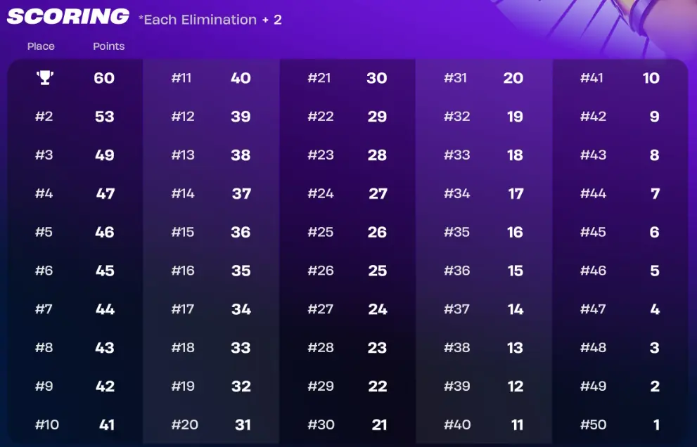 Since your only way to get the Fortnite Clix skin for free is by winning the Duos Reload Cup, it’s important to understand the scoring system first. First place awards 60 points, second place gives 53, and third place earns 49, with points decreasing for lower placements. Additionally, each elimination grants 2 points. Below is an image showing the full scoring breakdown: