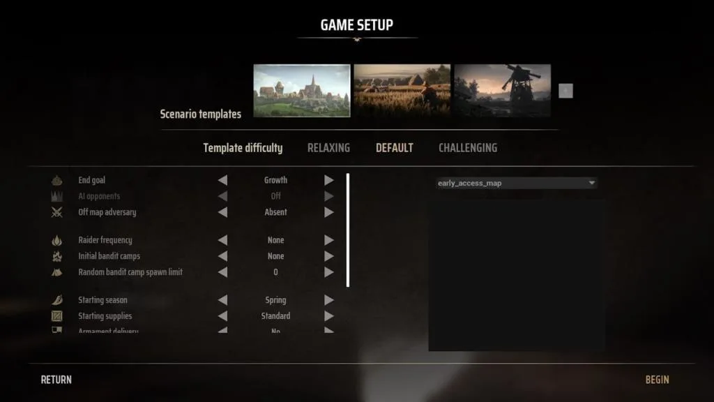For newcomers seeking to immerse themselves in city-building and grasp the game mechanics, I recommend starting with “Rise to Prosperity.” Once you feel comfortable, you can explore the other scenarios. Alternatively, if you prefer a preset difficulty level, Manor Lords offers three templates: “Relaxing” for casual enjoyment, “Default” for standard gameplay, and “Challenging” for those keen on politics and battles. Choose the option that best fits your preferences and begin your journey!