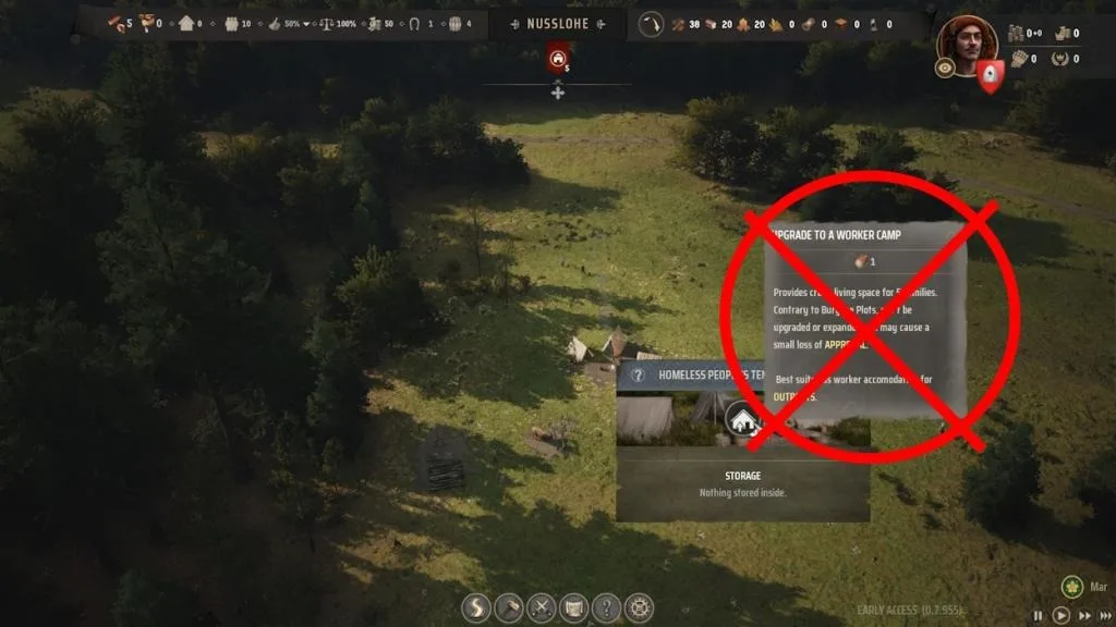Many Manor Lords players are eager to upgrade homeless tents to worker’s camps, but I advise against rushing into this decision. Currently, there’s a prevalent issue where homeless individuals won’t relocate to burgages when available. To avoid complications, refrain from upgrading tents for now and focus on laying the groundwork by constructing initial structures.