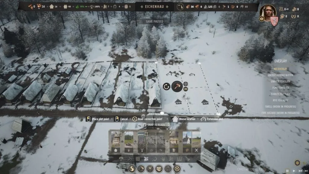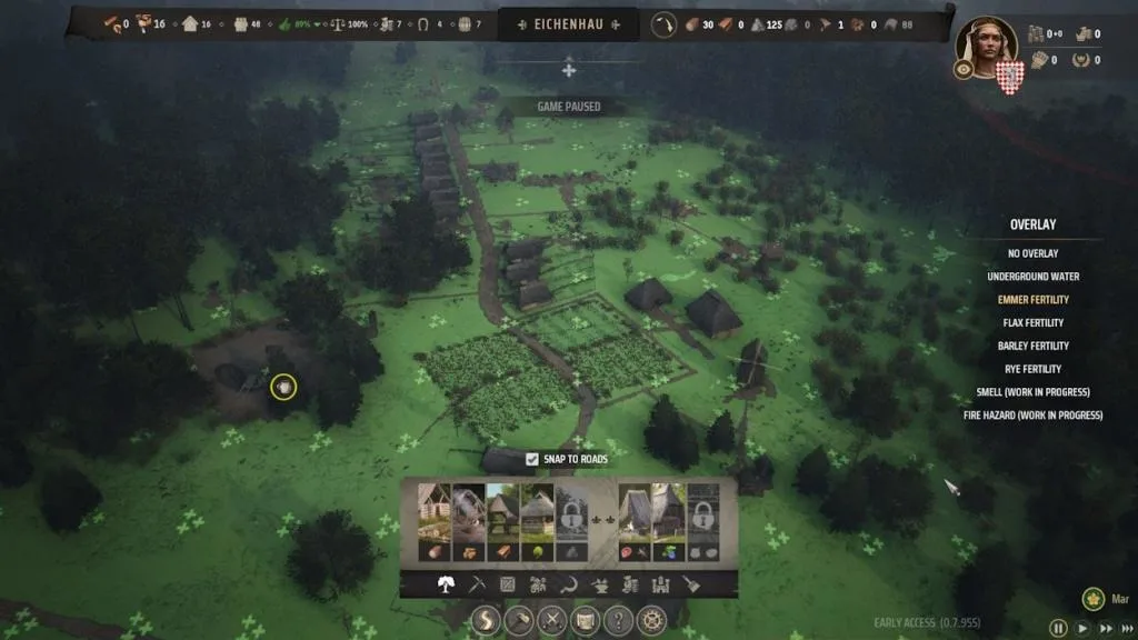 In Manor Lords, the land’s fertility is paramount, so it’s crucial not to overlook it. Neglecting proper planning can significantly impact your progression in the mid to late game. Utilize the build menu’s overlay feature to assess underground water reserves and soil fertility for various crops. When situating structures, prioritize preserving green patches of land, as they indicate higher fertility.