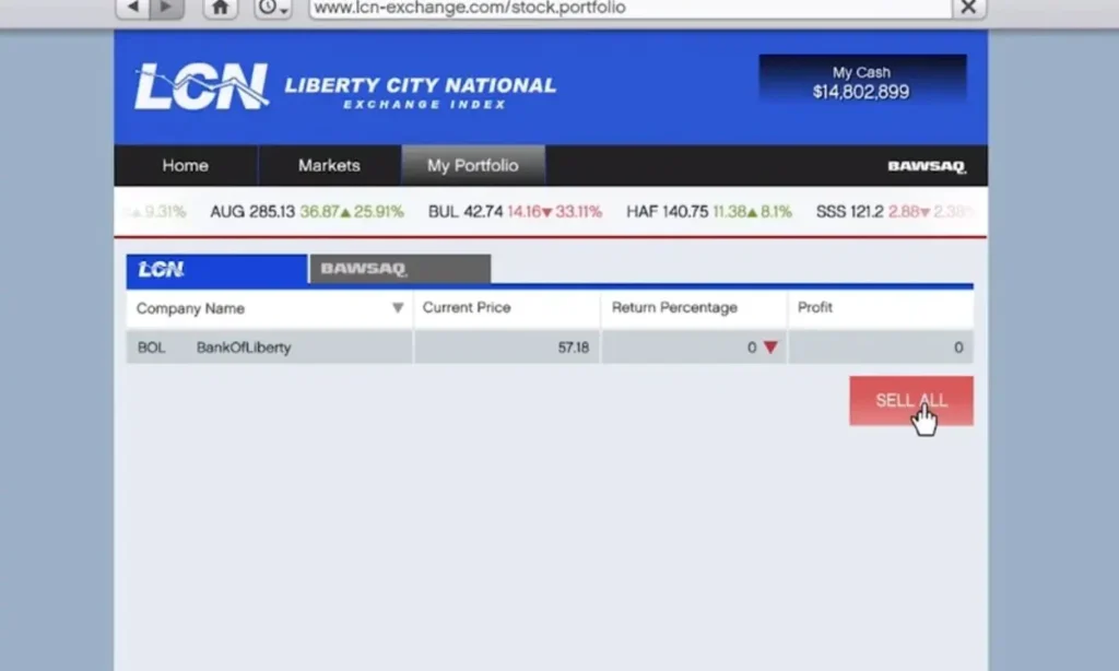 To access the stock markets, pull up your phone during gameplay, select the Internet icon, and navigate to the Money and Services tab, where you’ll find options for both LCN and BAWSAQ.