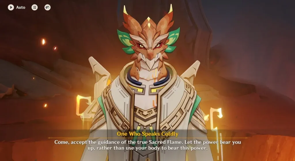 The Sage of the Stolen Flame, Kukulkan, will reveal himself to your Saurian Companion. He explains that he intended to bring the Companion here so they could choose to side with the dragons. After sharing significant lore, he asks your Saurian Companion to activate the Huitzilopochtli to trigger the Sweeping Skyfire.