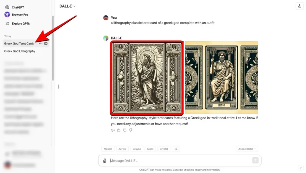 1. To get started, open ChatGPT in a web browser. Next, choose a discussion from the left sidebar where you created an image you want to modify. However, enter a new prompt to describe the image you want to induce, If you haven’t created one yet.