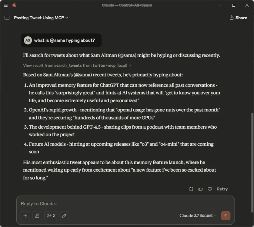 - Finally, I asked Claude to summarize what Sam Altman was buzzing about on X, and it analyzed his timeline to deliver a solid overview.