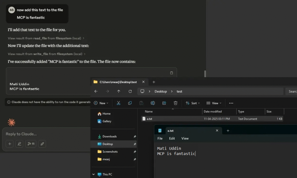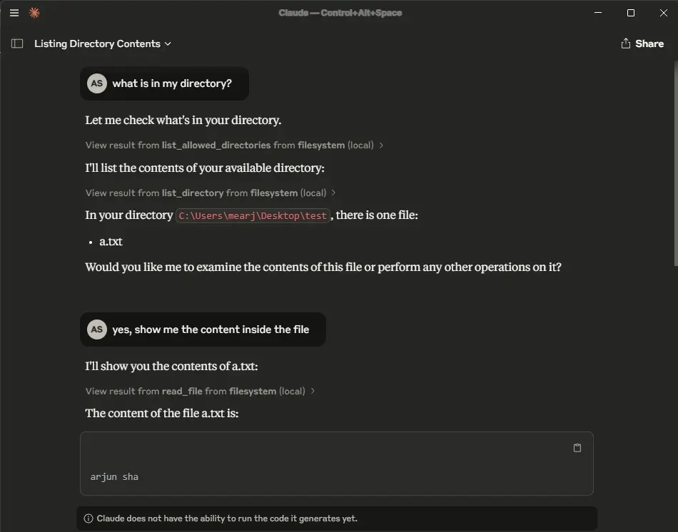 - Then, I requested Claude to show the file’s content, and it successfully retrieved the text.