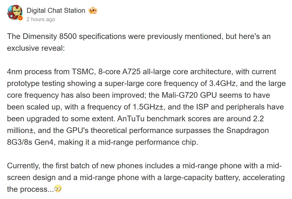 According to tipster Digital Chat Station (DCS), the upcoming Dimensity 8500 will be built on TSMC’s 4nm node and will house an octa-core setup consisting entirely of ARM Cortex-A725 cores—the same architecture found in the Dimensity 8400.