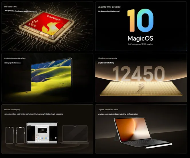 According to official teasers, the MagicPad 3 Pro will be the world’s first tablet to feature the Snapdragon 8 Elite Gen 5 processor. It will sport a 13.3-inch 3.2K LCD display with a 165Hz refresh rate, a 12,540mAh battery, and will run MagicOS 10 out of the box.