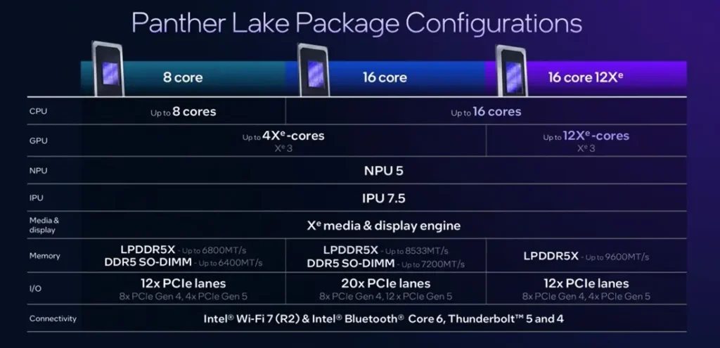 Regarding the NPU, Intel has integrated the NPU 5, capable of performing up to 50 TOPS (trillion operations per second), offering greater efficiency than Lunar Lake’s NPU 4. Additionally, Panther Lake processors come equipped with Wi-Fi 7 and Bluetooth 6 support.