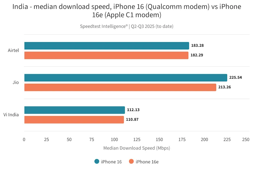 Data from Ookla’s Q2–Q3 2025 Speedtest Intelligence report reveals that the iPhone 16e delivered an average 5G download speed of 213.26 Mbps on Jio’s network—just below Qualcomm’s 225.54 Mbps benchmark.