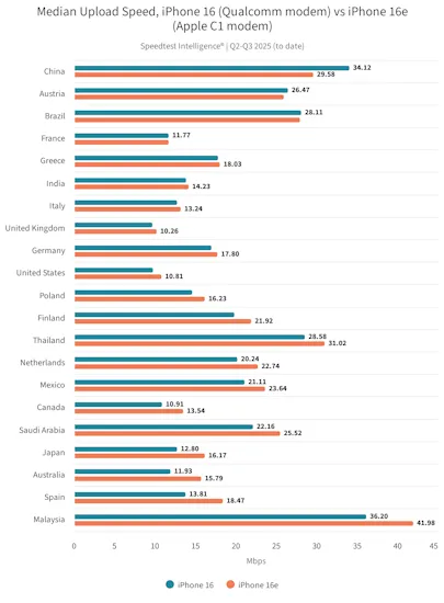 Outside of India, Japan has emerged as the top market for the iPhone 16e, while Qualcomm-powered models like the iPhone 16 continue to lead in peak speeds in the U.S.