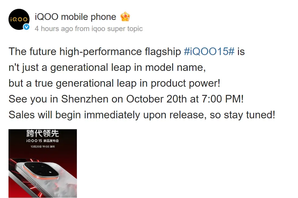 According to iQOO’s official Weibo announcement, the company will unveil its next flagship smartphone in China on October 20. The launch will take place at an in-person event in Shenzhen, beginning at 7:00 PM CST (4:30 PM IST). iQOO has teased that the upcoming model will represent not only a major upgrade in name but also a significant boost in performance, marking a true generational leap for the series.