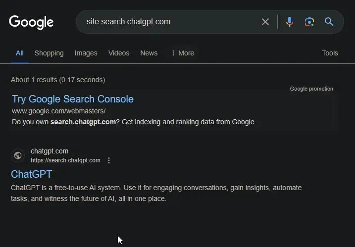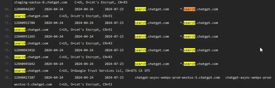 Delving deeper, I examined the SSL certificate for search.chatgpt.com, which indicates issuance on April 25, 2024, with an expiration date of July 24, 2024. Furthermore, Google has indexed search.chatgpt.com, though it is notably absent from Bing and DuckDuckGo searches.