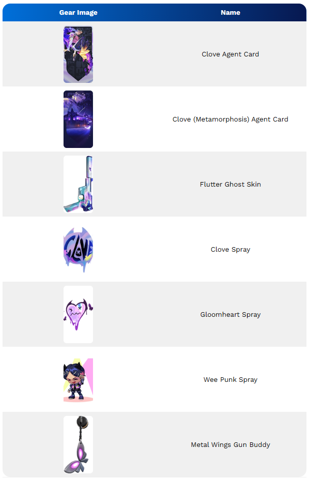 After the recruitment event concludes, Clove can be unlocked using Kingdom Credits in Valorant. The cost to unlock the new agent is 8,000 Kingdom Credits. Upon unlocking Clove, players gain access to their agent gear. Refer to the table below for details on Clove’s agent gear in Valorant: