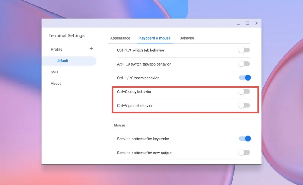You can adjust Terminal copy-paste behavior by right-clicking inside the Terminal and navigating to Settings > Keyboard and mouse. From here, you can toggle these features on or off.