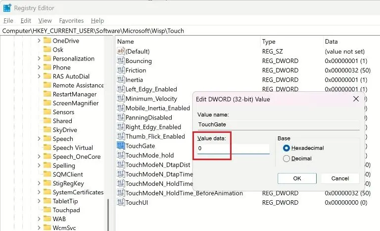- On the right side of the Registry Editor, locate “TouchGate” and double-click to open it.