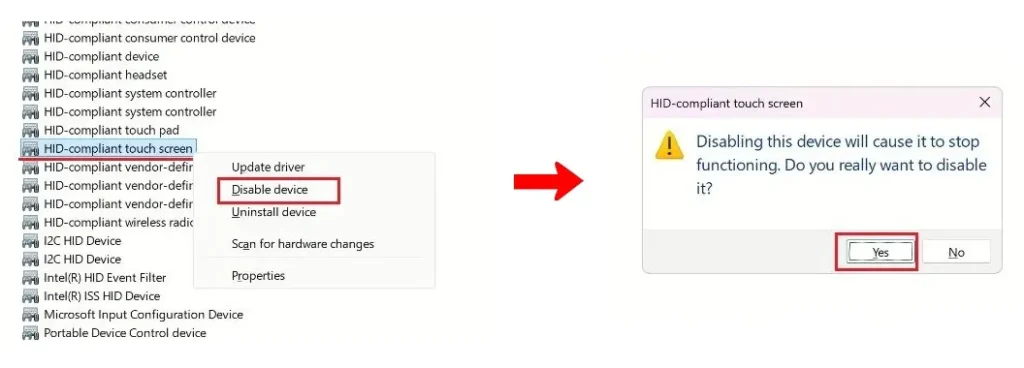 - Finally, click Yes when prompted to confirm and turn off the touch screen on your Windows 10 or 11 PC.